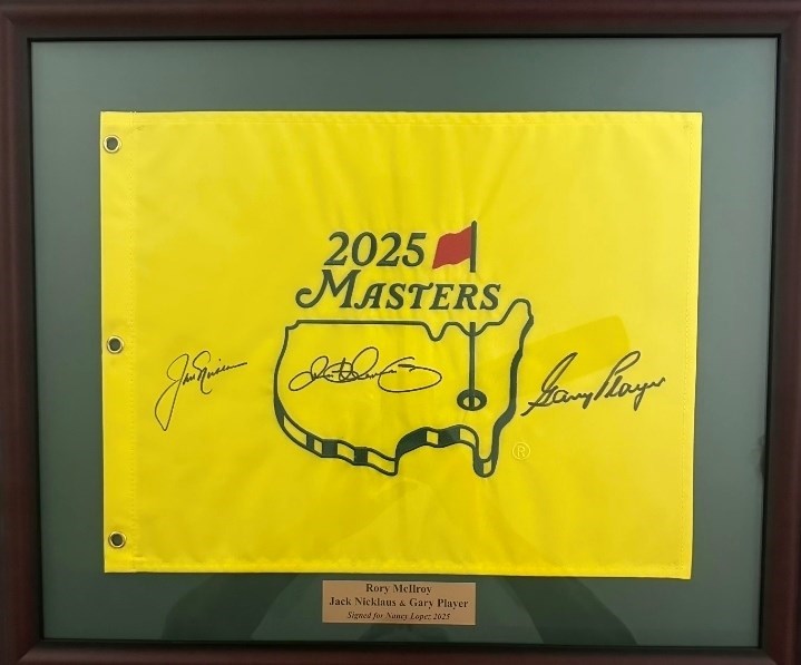 Rory Daniel McIlroy is a Northern Irish professional golfer who plays on the European Tour and the PGA Tour. He is a former world number one in the Official World Golf Ranking and has spent over 100 weeks in that position during his career. A five-time major champion, he is the sixth man to complete a modern career grand slam and the first European to achieve the feat. McIlroy was the 2025 Masters Tournament. The flag was autographed for Nancy Lopez by Rory McIlroy, Jack Nicklaus and Gary Player. This is a "PRICELESS" item! A reserve must be met. If not met, we will move it to the LIVE auction during the tournament venue.